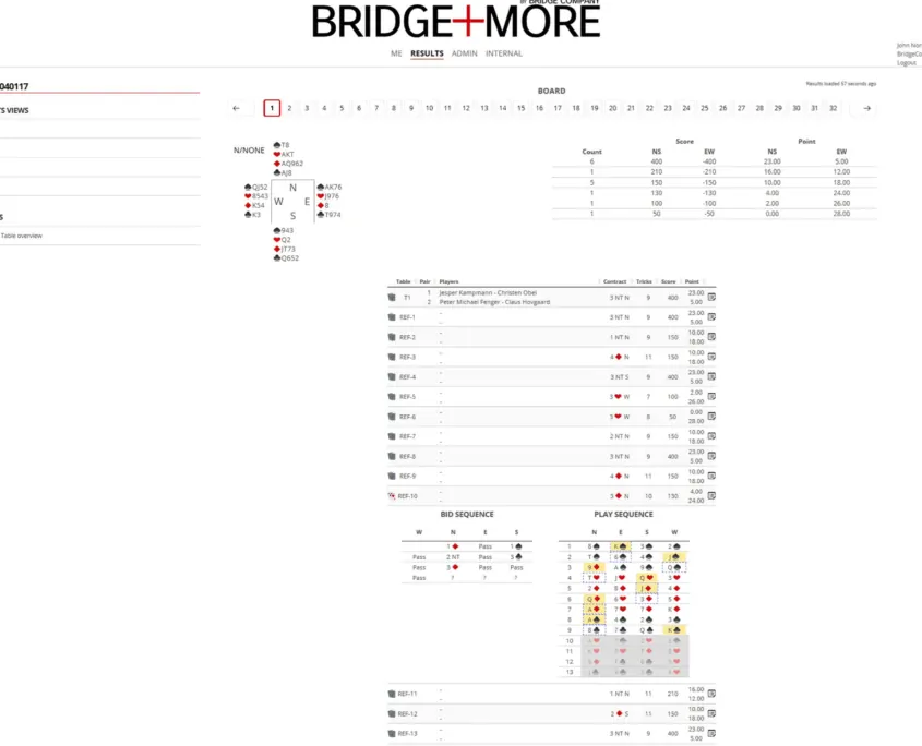 You can use a Bridge+More solution for much more than pair and team games in a club or at home – for example, a Re-play game where you play a specific game card distribution or even better play a well know tournament as if you had been present (as if there had been extra tables – we call it a Reference tournament – see an example below). You can play a Reference game at home or in a club – where ever you want.
