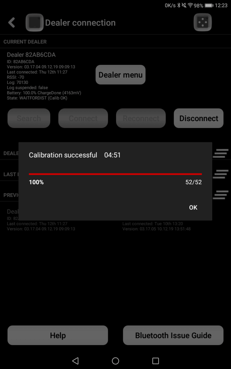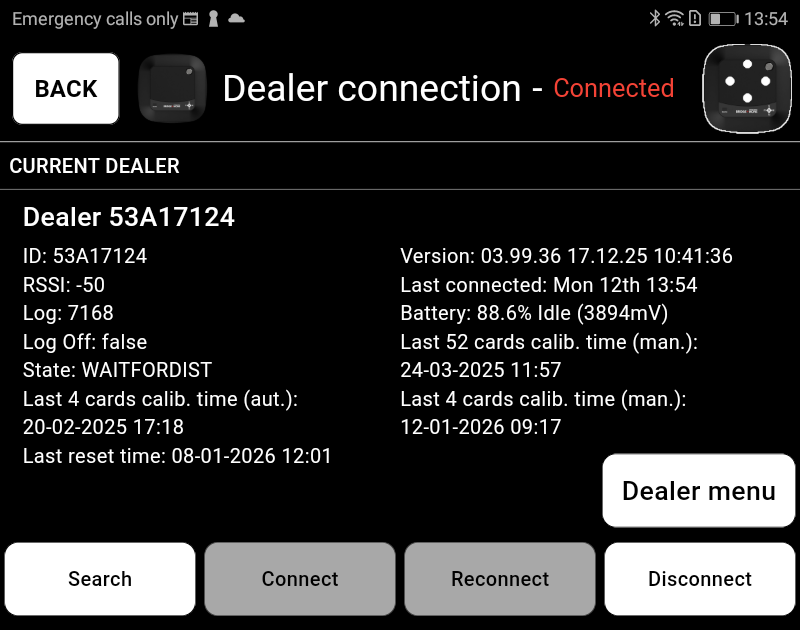 3. Go to the Main Menu of the app and click “Dealer Connection”. Once there, you will see all the information related to the dealer, including the last date and time a successful calibration was done.
