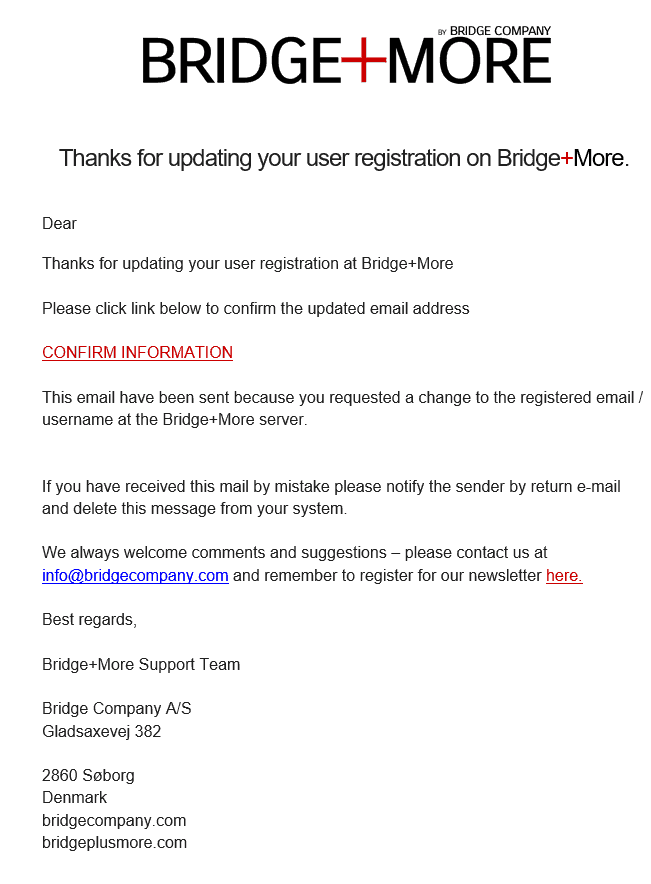If you change your email address please notice you will receive an email See below) – on the new updated email address – with a link, which you need to press to 1. confirm you own the email and 2. ensure us the email is entered correctly.