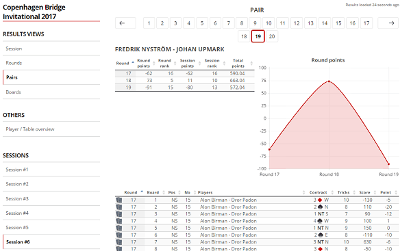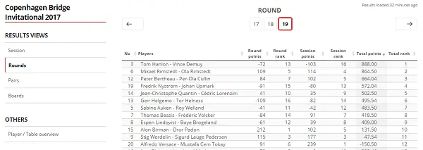 Results are presented in real time – please notice not before all tables have finished a round can you see the updated results – but immediately hereafter you will be able to see the updated results.