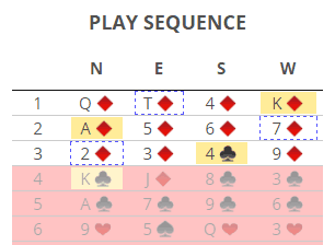 The dotted line around a card shows it was the lead – yellow shows the wining card. Above – first hand 4 of diamonds opened and the Queen of diamonds won.