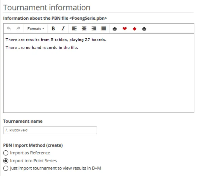 Use the “PBN Import Method” to select the purpose of the import. If you “just import” – you can later add the tournament to a Point Series, but if this is the purpose, you might as well do it here.