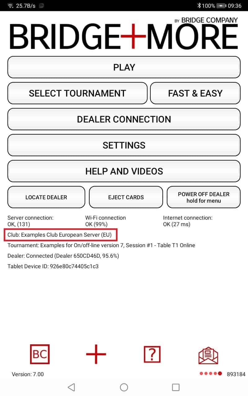 On the front menu of our dealer app, you can always see the name of the club selected on bridgeplusserver.com – Admin – Tablets. The EU after the club name is the server name