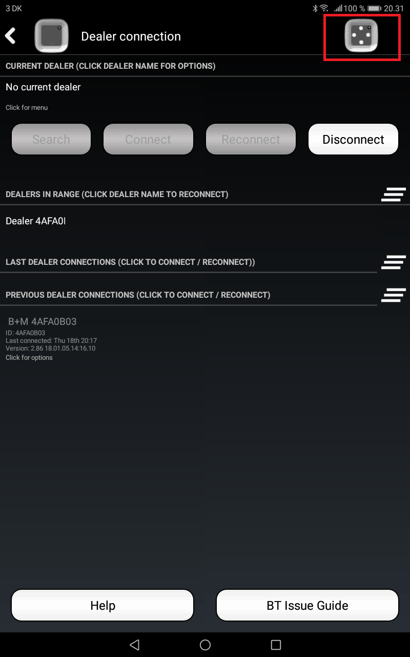 - Open the main menu of the Bridge+More app – select “Dealer connection” in the main menu